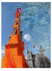The project showcases this undeniable connection and the fight of a different force eyeing river environments, that of hydro-fracking. The art integrates painted imagery with photographs of the Tioga County Historical Society Museum, and Courthouse. Posters are for sale